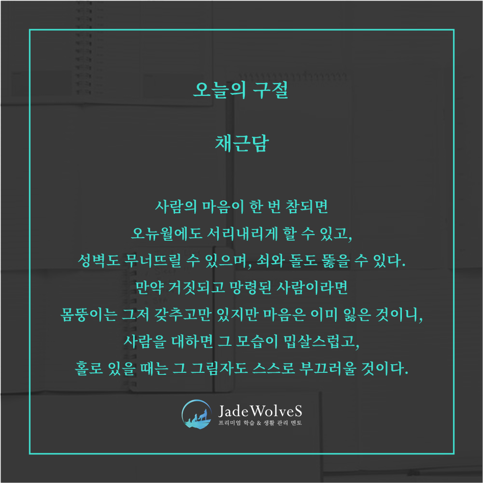 사소한 잘못이라도 저지르고 나서 후회하고 깊이 뉘우치는 사람이 있고 큰 잘못을 저지르고도 진심으로 뉘우치지 않고 뻔뻔하게 행동하는 사람이 있습니다. 오늘 소개한 채근담의 한 구절은 우리가 어떤 사람으로 살아가야 하는지 잘 알려줍니다. 거짓으로 나를 둘러싸고 살면 결국 거짓은 세상에 드러나기 마련입니다.