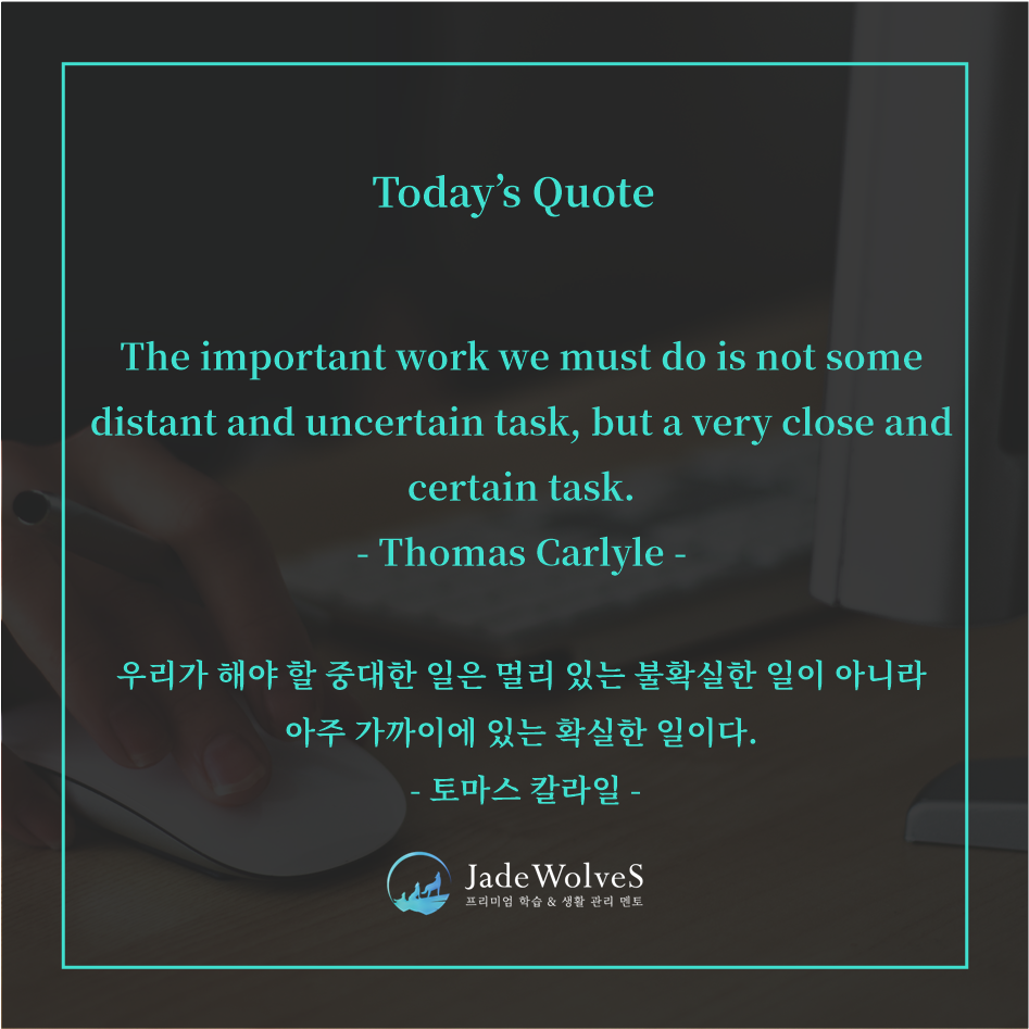 토마스 칼라일은 영국 출신의 비평가이며 작가이다. 그는 스코틀랜드의 청교도 가정에서 태어나 칼뱅주의의 영향을 많이 받았다. 칼뱅주의는 성경의 교리에 더 엄격하게 따라 하는 사상을 일컫는다. 그의 작품 "프랑스 대혁명" "영웅숭배론"이라는 책을 통해 사람들을 이끄는 영웅 즉 신의 존재가 필요하다고 말했다. 그의 명언처럼 자기 삶에 불만을 일삼는 사람은 그 일이 삶의 걸림돌이지만 그 일을 자신의 성장으로 삼았던 사람들은 큰 성공을 이루는 것을 보았다. 항상 자신 앞에 놓인 시련을 장애물이라 여기기보다 성공을 위한 초석이라 생각하면 어떨까?