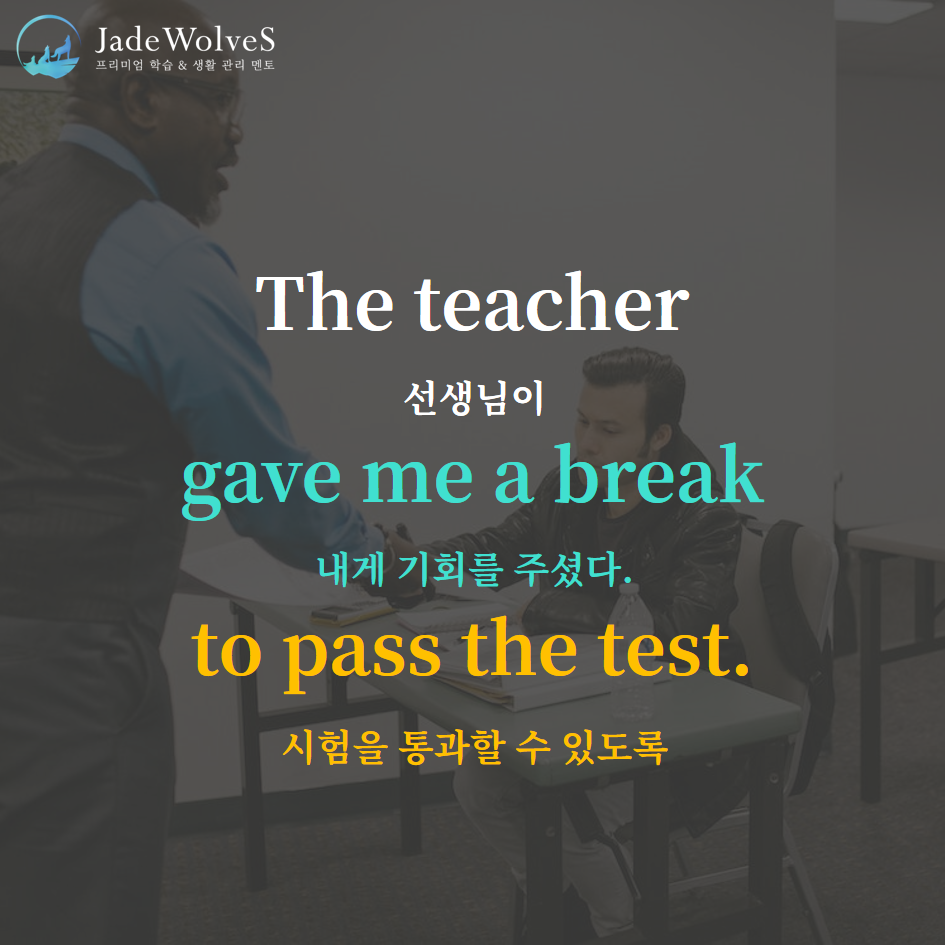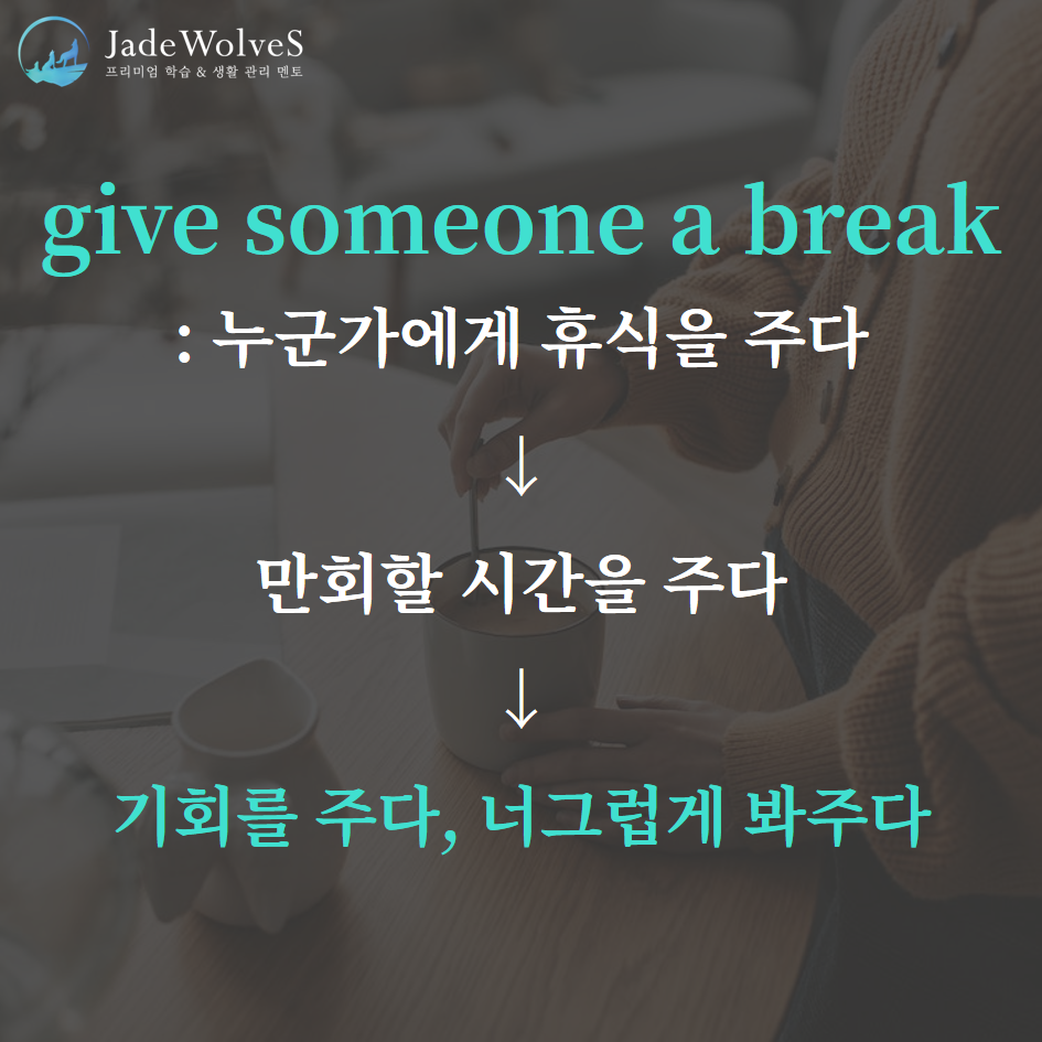 2) give someone a break : "만회할 시간을 주다"라고 해서 "기회를 주다, 너그럽게 봐주다"라는 의미로 사용됩니다.
