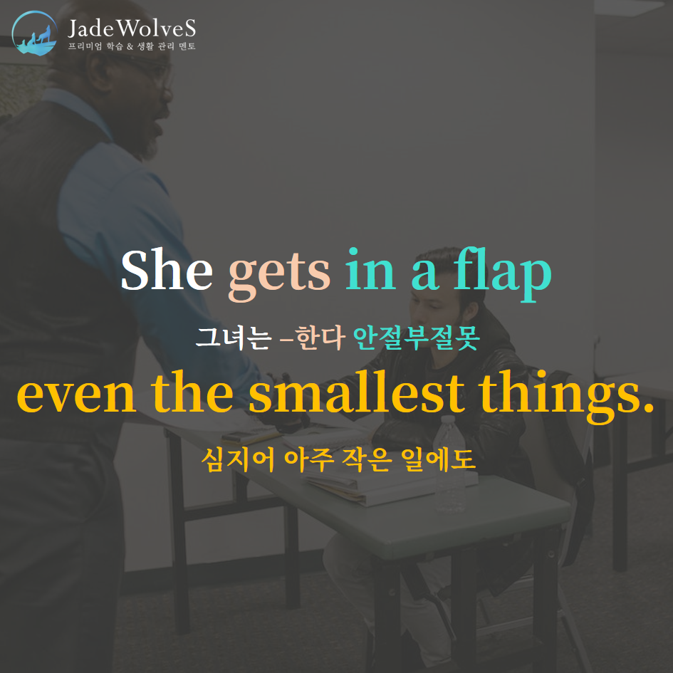1) in a flap : "흥분한 상태"라고 해서 "안절부절 못하는"이라는 의미로 사용됩니다.