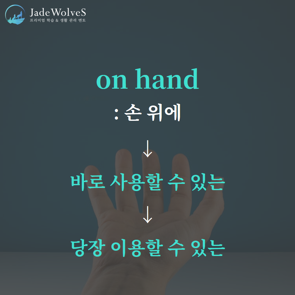 2) on hand : "손 위에"라고 해서 "당장 이용할 수 있는"이라는 의미로 사용됩니다.