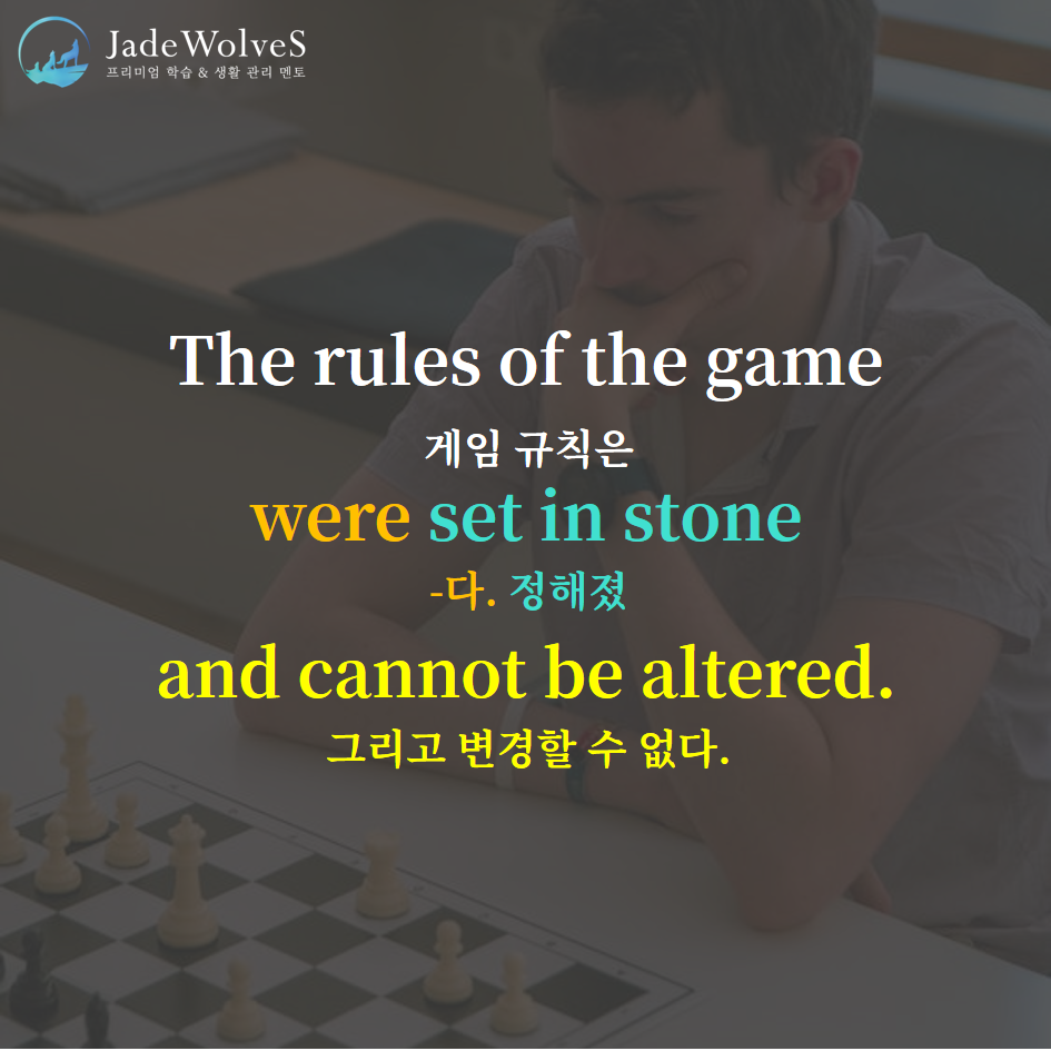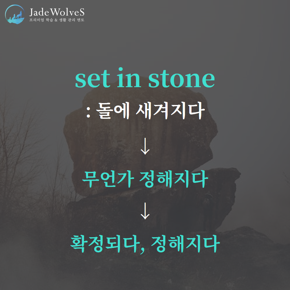 2) set in stone : "돌에 새겨지다"라고 해서 "확정되다, 정해지다"라는 의미로 사용됩니다.