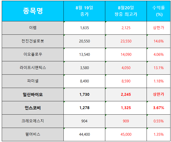 | 오늘의 관심 종목 수익률(2024.08.21) (1) | 2024.08.21 |
