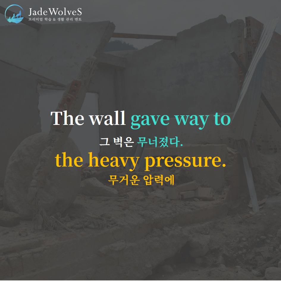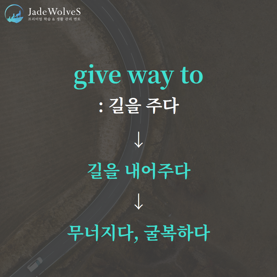 2) give way to : "길을 주다"라고 해서 "무너지다, 굴복하다"라는 의미로 사용됩니다.