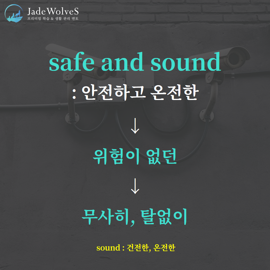 1) safe and sound : "안전하고 온전한"이라고 해서 "무사히, 탈없이"라는 의미로 사용됩니다.