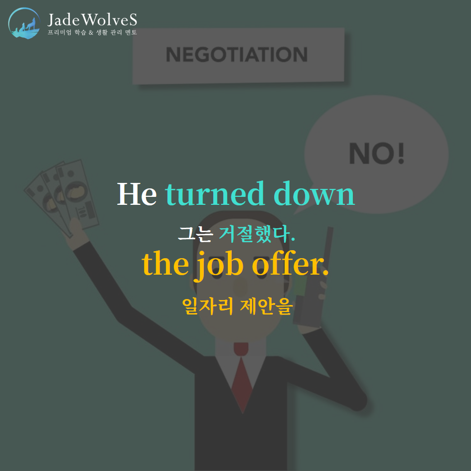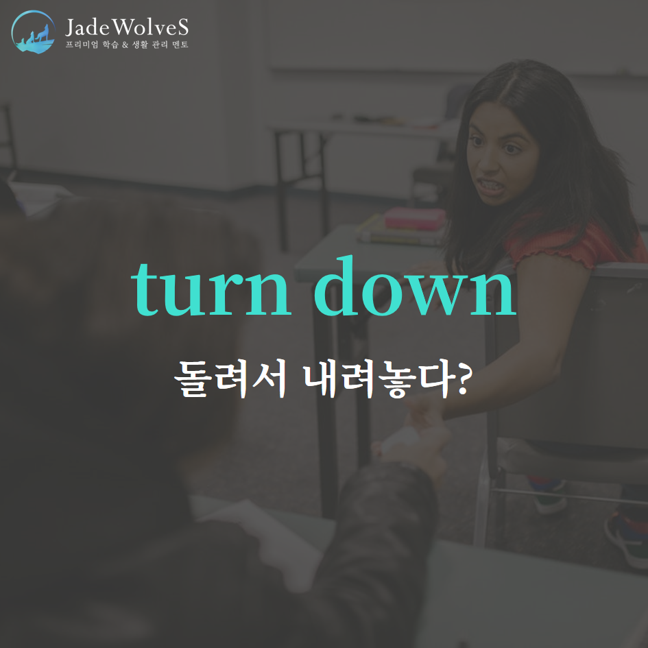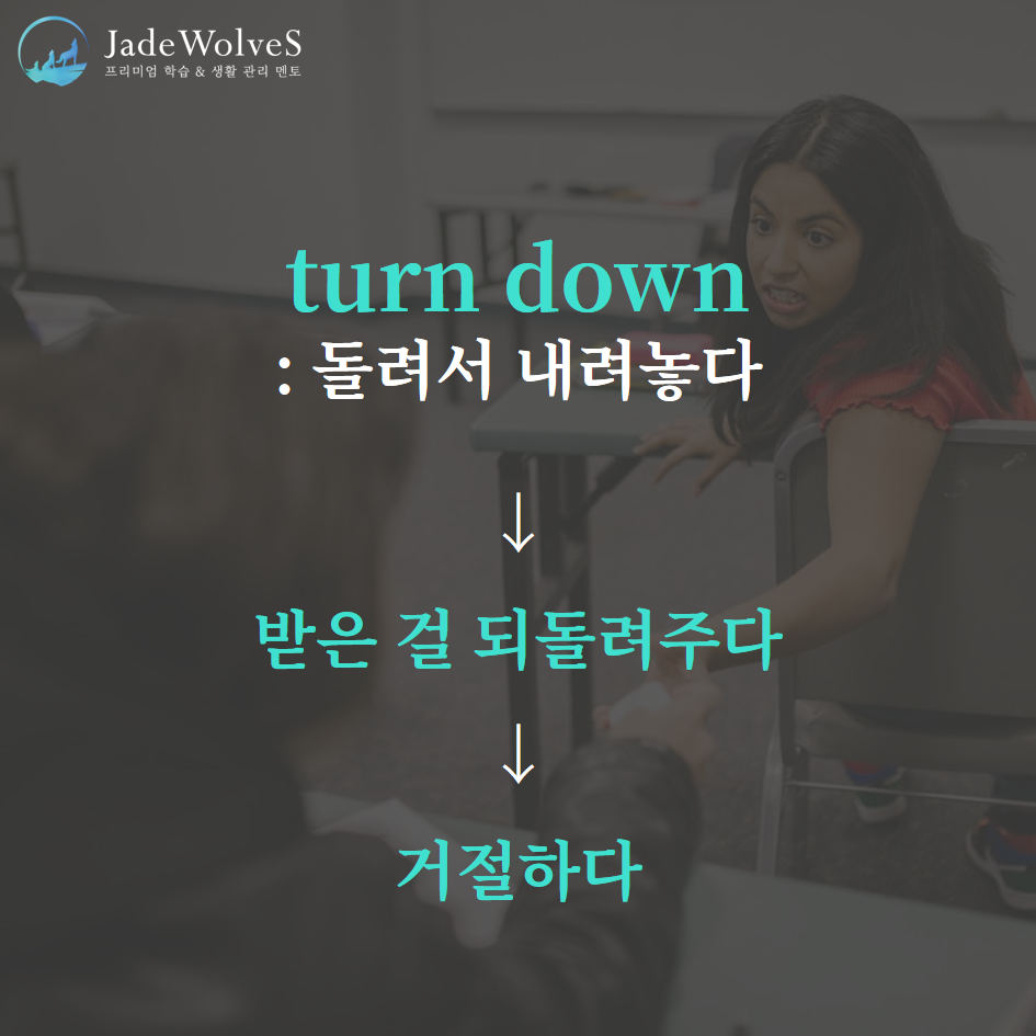 2) turn down : "돌려서 내려놓다"라고 해서 "거절하다"라는 의미로 사용됩니다.