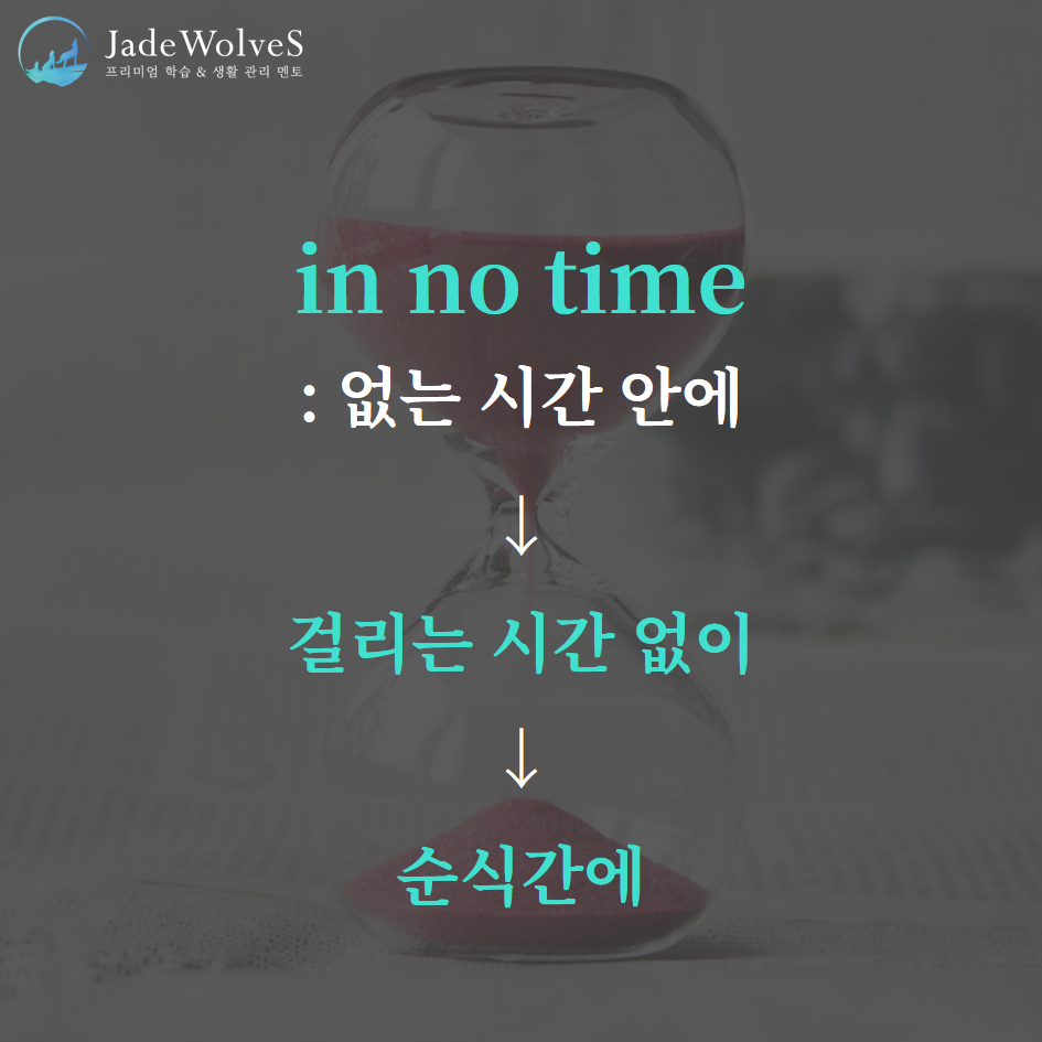 2) in no time : "없는 시간 안에"라고 해서 "순식간에"라는 의미로 사용됩니다.